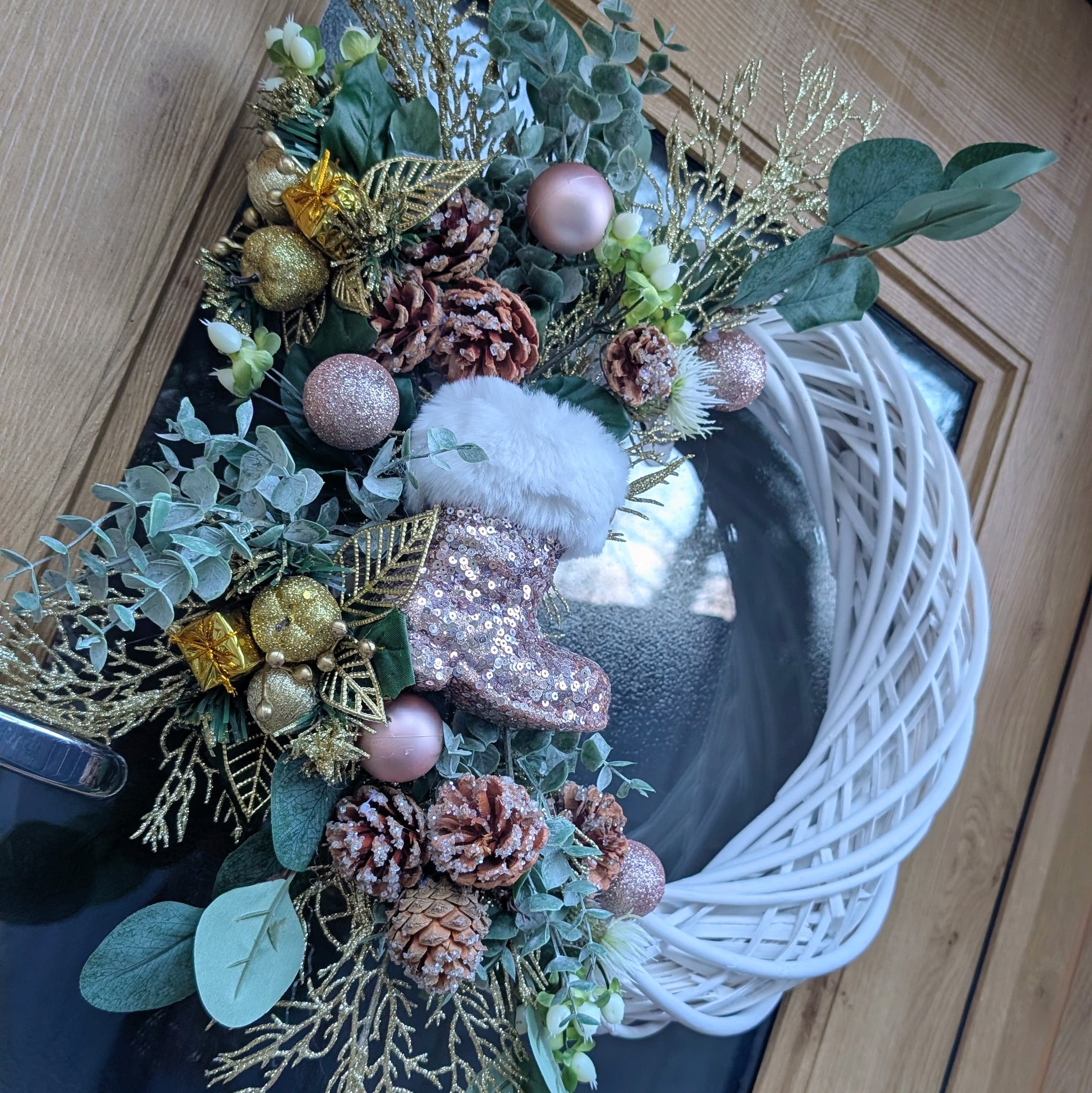 Designed on a traditional white rattan base, around 38cm diameter, extended out to 45cm+ with a pink Santa boot and gold foliage.