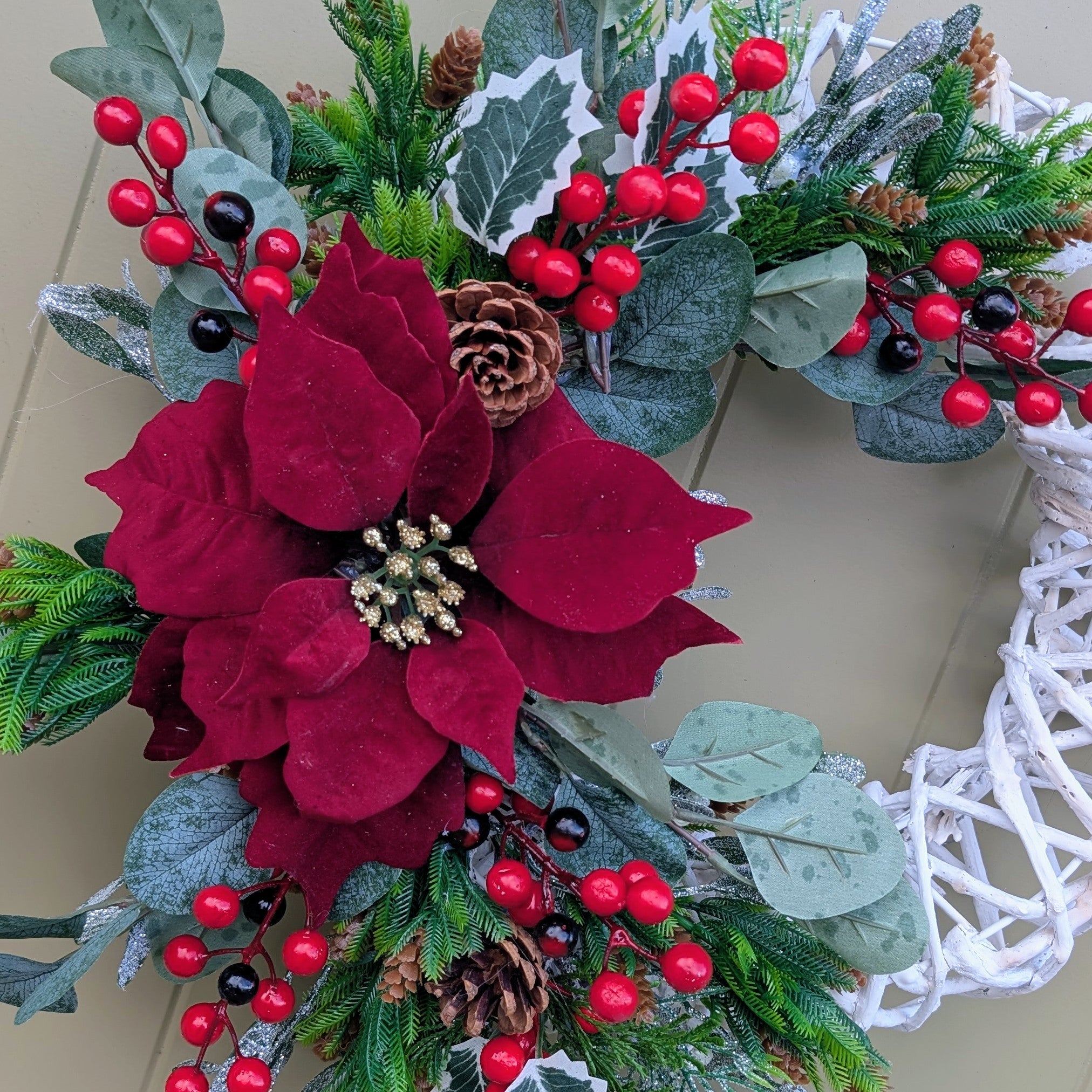 Designed on a traditional white rattan base, around 38cm diameter, extended out to 45cm+ with a focal poinsettia and festive foliage.